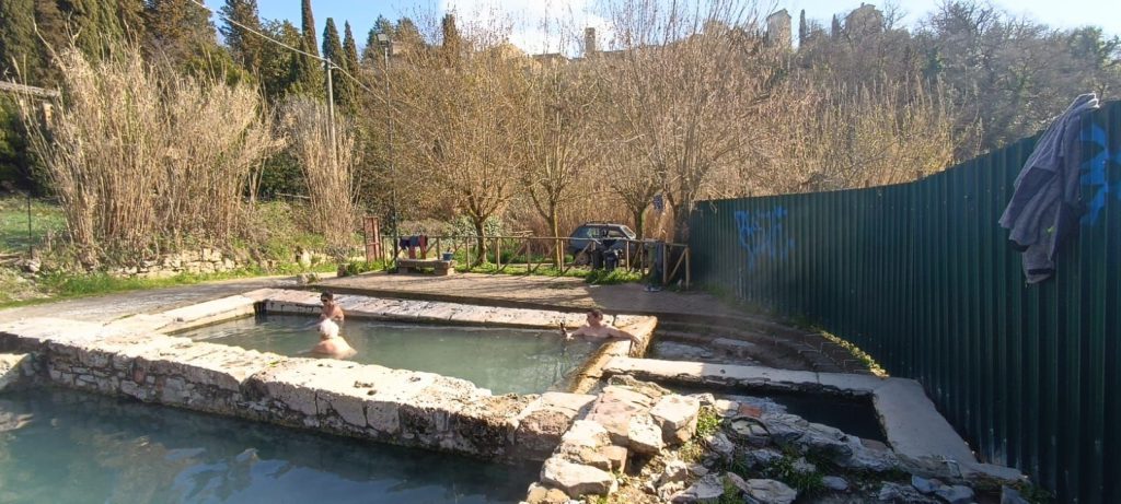 Il 13 marzo la musica è finalmente cambiata. Dopo una colazione tranquilla, ci siamo diretti verso le terme libere di San Casciano. Queste vasche naturali, conosciute fin dall’epoca romana per le loro proprietà curative, offrono un’esperienza primordiale: immergersi nell’acqua calda mentre l’aria intorno è ancora fresca è il modo migliore per lavare via la stanchezza dei giorni passati. San Casciano è un luogo dove il tempo sembra essersi fermato, un borgo che domina la valle e che custodisce una storia millenaria legata proprio alle sue sorgenti termali. Rigenerati dal calore dei bagni e dopo un pranzo veloce, abbiamo ripreso la marcia verso nord. La tappa serale ci ha portati a Bottagna, in provincia di La Spezia, un punto strategico per riposare prima dell’ultimo balzo verso casa.