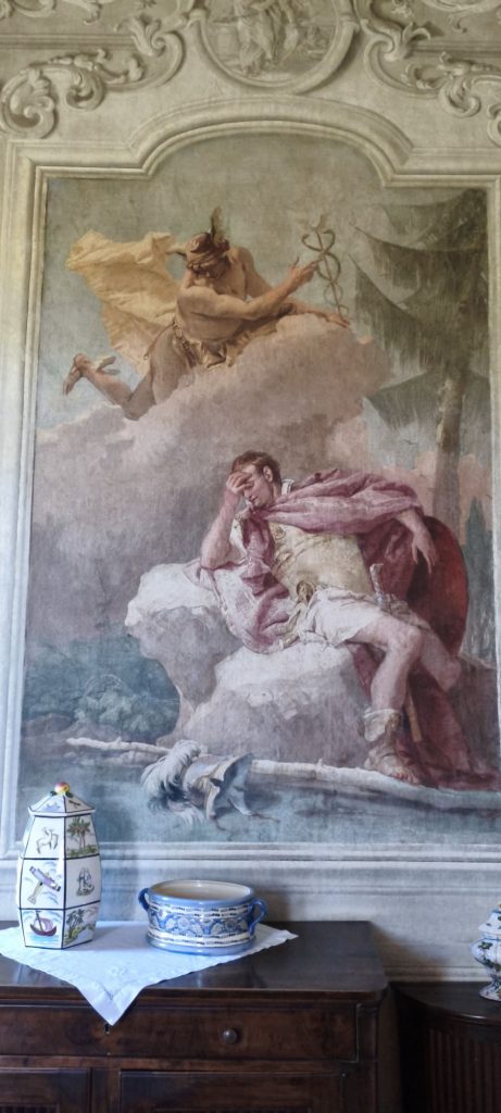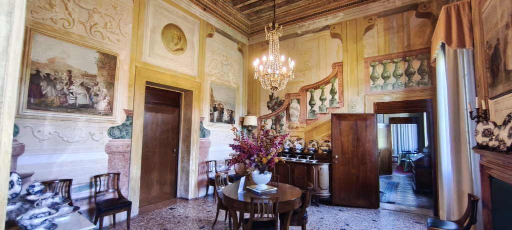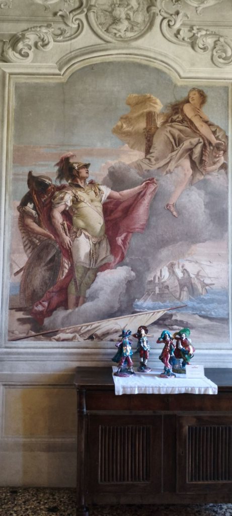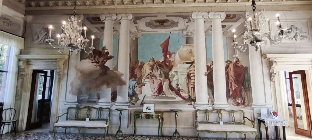 Dal punto di vista artistico, la villa è impreziosita dagli affreschi di Giambattista Tiepolo e del figlio Giandomenico. Gli interni raccontano storie tratte dalla mitologia e dalla letteratura epica, con una straordinaria capacità narrativa e una vivacità cromatica che cattura immediatamente lo sguardo. Gli affreschi non sono semplici decorazioni, ma veri e propri racconti visivi che accompagnano il visitatore in un viaggio tra sogno e realtà.